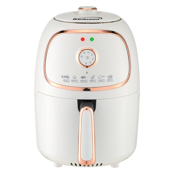 • 1,200 watt electric air fryer uses hot-air circulation to cook quickly and evenly using little-to-no oil;• 2-qt. capacity ideal for personal use;• 175deg F to 400deg F temperature range cooks all types of foods;• Nonstick surface allows fast cleanup with little mess;• Set-it and forget-it 30-minute timer with auto-shutoff ;• Serves freshly fried foods with cool-touch, removable fry basket;• Quick temperature guide;• cETLus approval code;• 1-year warranty;• Includes fry pan, fry basket, and instruction manual;• White;